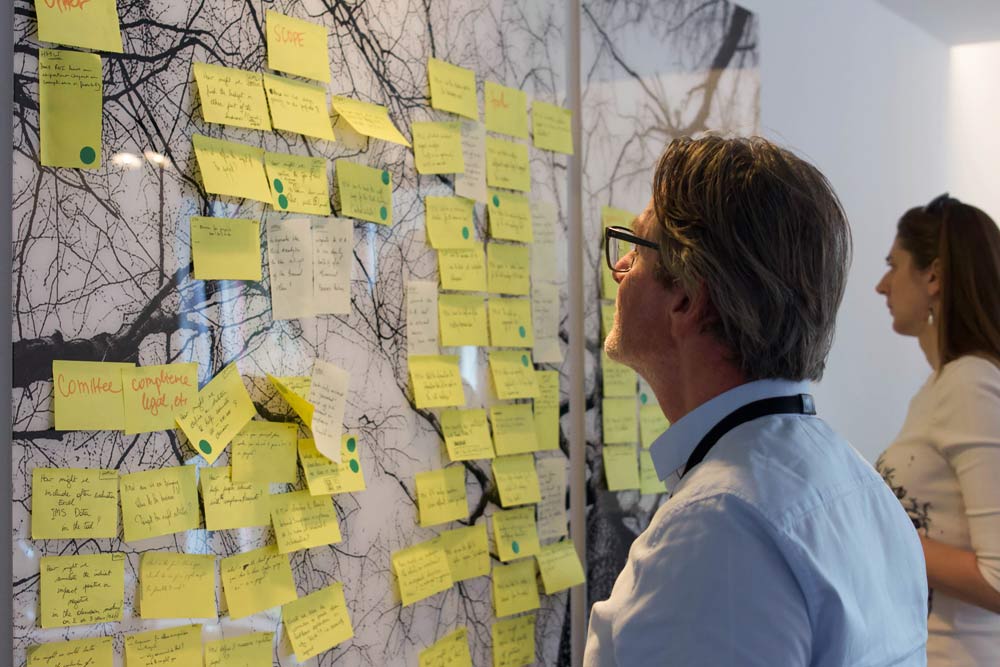 The afternoon, however, proved to be a bit more challenging. Aside from the habitual after-lunch lull, the Ask the Experts session went on a bit longer than expected and the concept of How Might We notes proved difficult. Ask the Experts is fairly self-explanatory — we and/or the client invite a number of field experts to answer pertinent questions about their field and possible issues or aspects about the Sprint topic. During these ‘interview’ sessions, everyone is asked to take individual notes. But rather than just summing up a list of bullet points, they’re asked to pose it as a “How might we…” question. For example, if the expert mentions a number of approval rounds needed to approve an idea, the question on the note could be “How might we decrease the number of and time spent on approval rounds?” The idea here is to force Sprint participants to focus on solutions rather than problems. However, this way of note taking proved to be difficult to adopt for nearly everyone – we were asking them to perform two tasks at the same time, both quite unfamiliar to them. On the one hand, they were asked to act as interviewers, almost investigators. On the other hand, they needed to rethink and rephrase every note they took into a “How might we…” question rather than just writing it down. Still, the group managed to generate a lot of notes and questions that were put up on one of the glass displays in the meeting room. Our next step was organising these How Might We notes and voting on the best ones.