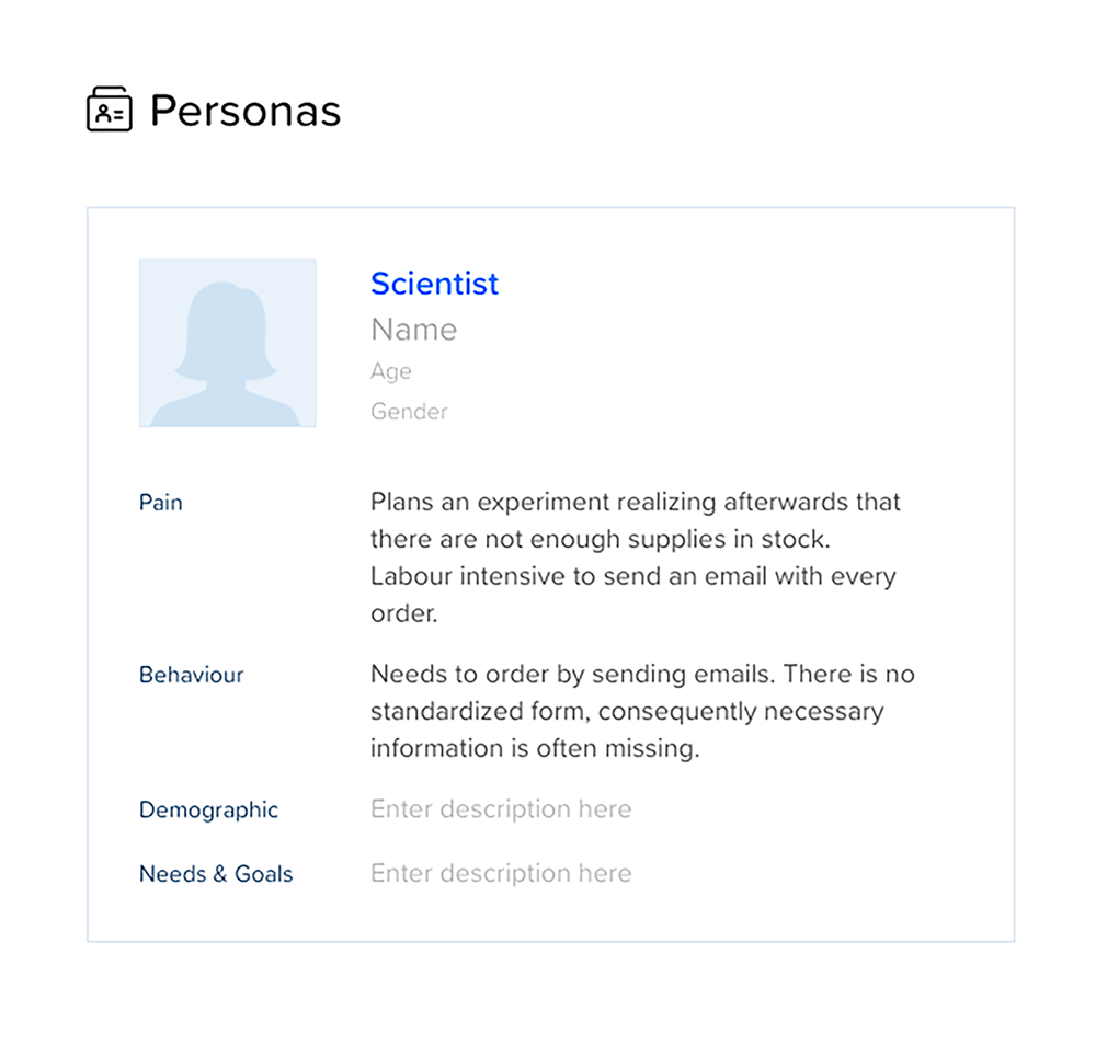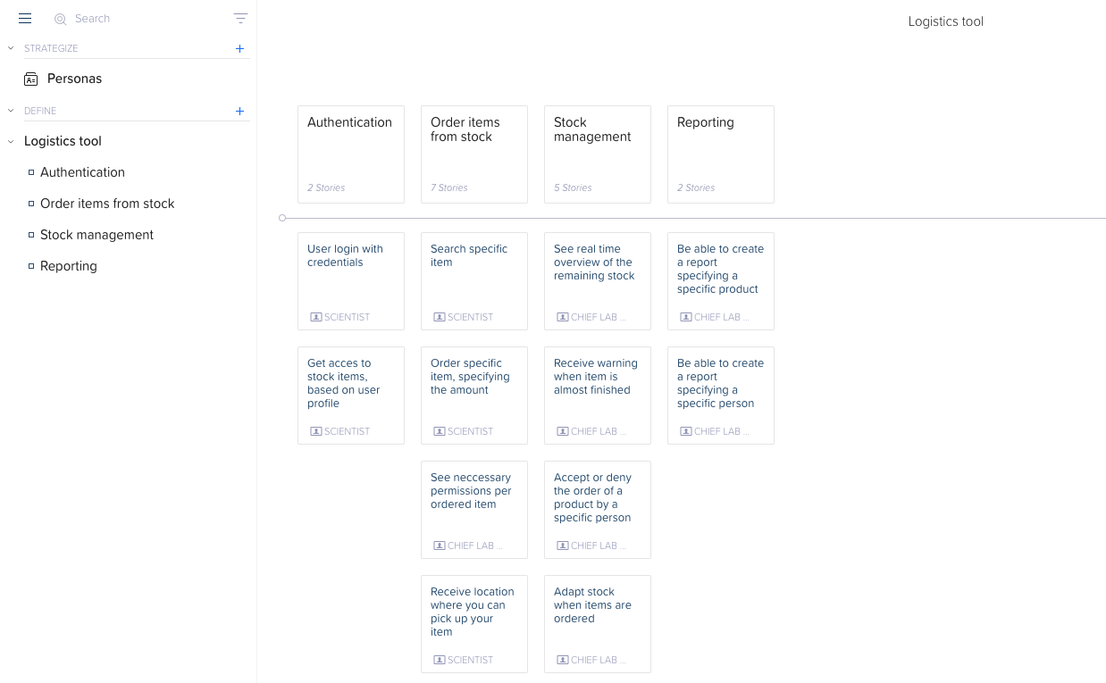 Based on our client’s feedback, we could start the story mapping to refine our initial ideas and improve the basic wireframes. A first step was creating personas to describe the roles of the users within the organisation, their current pain- points, daily activities and how they would interact with the new application. For this, we used a web application called craft.io.
